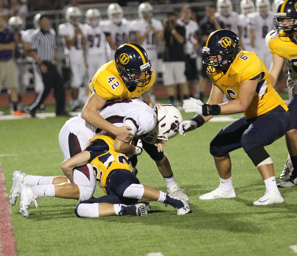 Unionville’s defense led by linebackers Dylan Rappucci, Laz Kirifiedes and Trevor Gardiner were able to bottle up Garnet Valley’s explosive triple option offense all night. Jim Gill Photo.
