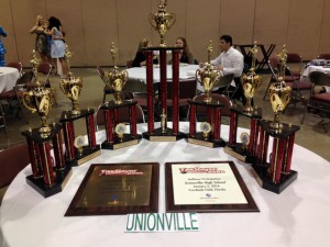 An impressive display of the ‘hardware’ earned by the Marching Indians at the 2016 Taxslayers Gator Bowl marching band competition.
