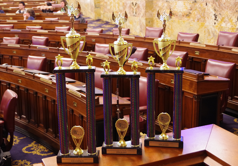 Finalist trophies await the top three high school academic teams for the Pennsylvania State Academic Competition at the Pennsylvania State Capitol.
