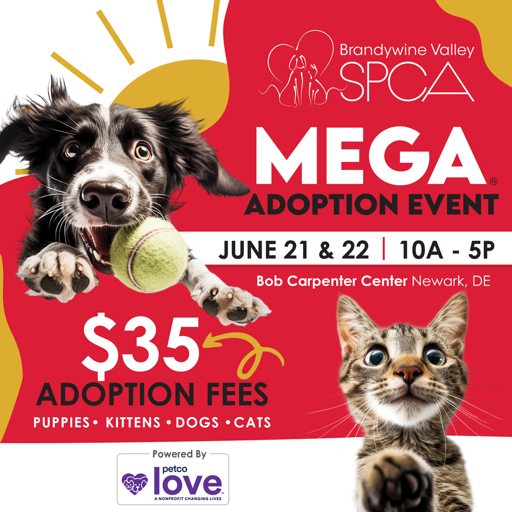 More than 1,000 pets will be looking for homes as part of Brandywine Valley SPCA’s (BVSPCA) Summer Mega® Adoption Event powered by national nonprofit Petco Love. The Summer event will be held at the Bob Carpenter Center at the University of Delaware in Newark on June 21 and 22 from 10 a.m. to 5 p.m. Dogs, cats, puppies, and kittens from BVSPCA and participating partner organizations will be available for just $35 in adoption fees throughout the event.