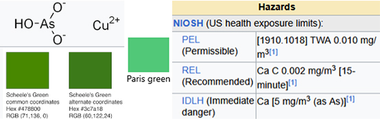 Figure 1: Left: Two modern non-toxic color variations of Scheele’s green (the pigment on the left – Hex #478800 – is considered more representative of the original color) and Paris green; Right: Exposure limits for Scheele’s green with a recommended maximum exposure of about 2 micrograms/cubic meter in 15 minutes. Paris green has a similar exposure limit. Information obtained under Fair Use from References 1 and [2].