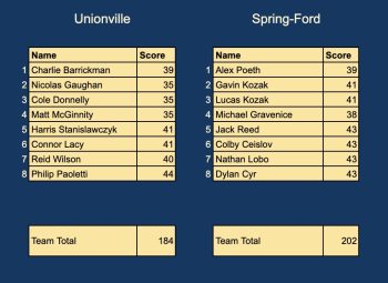 The Unionville boys varsity golf team played Spring-Ford today in a non-league matchup. The match result was: