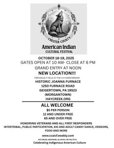 The Chester County American Indian Cultural Festival will be held at Historic Joanna Furnace (1250 Furnace Road, Geigertown, www.chescoamericanindianculturalfest.com) on October 18 and 19.The local “Native American Cultural Festival” features dance, drums, craft vendors, kids’ activities and live music.