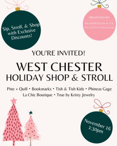 West Chester Holiday Shop & Stroll will be held on November 16 from 1:30-5 p.m.Visitors will be able to get a head start on holiday shopping and support local businesses at the same time at the inaugural West Chester Holiday Shop & Stroll.