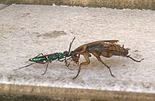 Figure 3: Wasp ‘walking’ a roach. From: https://en.wikipedia.org/wiki/Emerald_cockroach_wasp