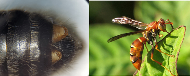 Figure 3: Strepsipteran larvae protruding from the abdomen of a bee (left), and wasp (right). Bee photo credit: Jessica Hird. https://extension.oregonstate.edu/catalog/strepsiptera-strange-parasite-attacks-bees-other-insects. Wasp photo credit: https://genent.cals.ncsu.edu/insect-identification/order-strepsiptera/