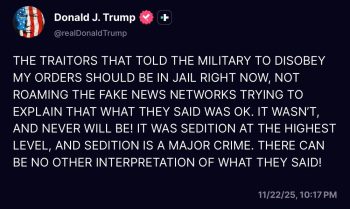 The six were vilified, with President Donald Trump Thursday saying Democrats had committed “SEDITIOUS BEHAVIOR AT THE HIGHEST LEVEL,” claiming such acts were “punishable by DEATH” and that the six “should be ARRESTED AND PUT ON TRIAL. … An example MUST BE SET.” He later reposted a social media comment calling for the six to be hanged and then later posted himself: “SEDITIOUS BEHAVIOR, punishable by DEATH.”
