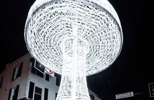 The Mushroom, adorned with twinkling lights, is lifted several stories high and suspended in anticipation above Kennett Square. Come midnight, it gracefully descends, casting its radiant glow and ushering in the New Year in style.